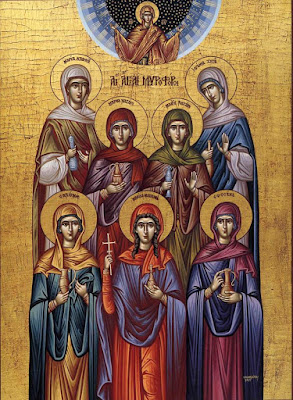 Έκανες τις Μυροφόρες γυναίκες φορείς του αγγέλματος της Ανάστασης και της δόξας Σου. Δεν έχρισαν το νεκρό Σου σώμα· Εσύ έχρισες τις ζωντανές ψυχές τους με το μύρο της χαράς. Εκείνες που θρηνούσαν το νεκρό Κύριο, έγιναν χελιδόνια της καινούργιας άνοιξης, άγιοι στην ουράνια βασιλεία Σου.